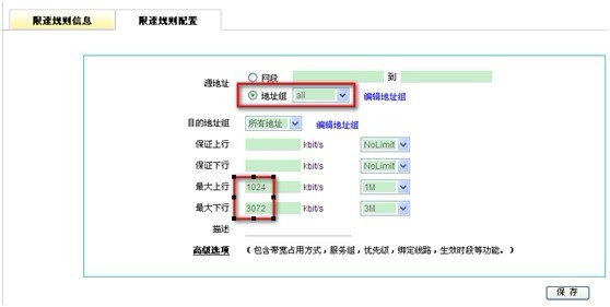 首先设置一个整体的限速,源地址选择之前新建的地址组名,设置好最大上行和下行带宽后点击保存。