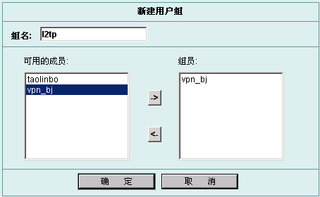 2) 填入“组名”为“l2tp”,将“vpn_bj”用户添加到组员中去。单击“确定”。