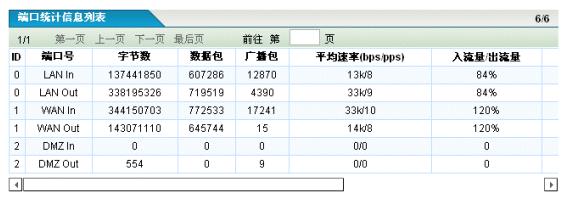 内部局域网口和广域网口的流量,通过系统状态――>端口统计,可以查看各个LAN口,WAN口和DMZ口输入输出的字节数、广播包的数量,各个方向流量的平均速率,用BPS和PPS分别表示,WAN口的输入相当于下载的流量,在网络内部流量比较正常的情况下,LAN口的out应该和WAN口的in比较接近,LAN口的in和WAN口的out比较接近。从这个图上可以很容易地了解到当前网络流量状态。