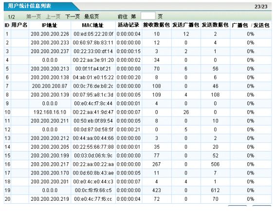 上的用户机器的IP地址和MAC对应关系,以及该用户自从上线以来的接收和发送的包的数量,如果某个用户的下载的包的数量特别大,那么该用户可能在大量下载,或者有其他攻击行为,这就提醒管理员注意。
