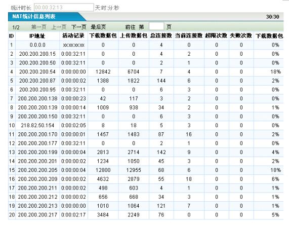 上能看到它所占用的连接数,包括总连接数,当前连接数。如果某些机器的超限的连接数比较多,那么多半这个用户有了DoS攻击,如果出现了失败的连接数,那么说明整个网络所需要的NAT连接数已经超过系统的连接数,有2种可能的原因,一种是攻击太多了,如果没有攻击,那么说明这个机器的性能已经不能适用,需要更换更好的设备。