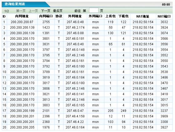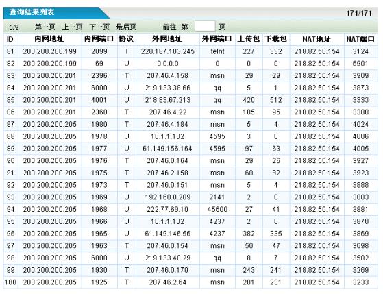 管理软件的查询界面,输入需要查询的对象,可以是内部网络的地址,也可以是外部网络的服务器地址。以下例子给出的是内部网络机器的上网行为,如查看内部有哪些机器在使用MSN。