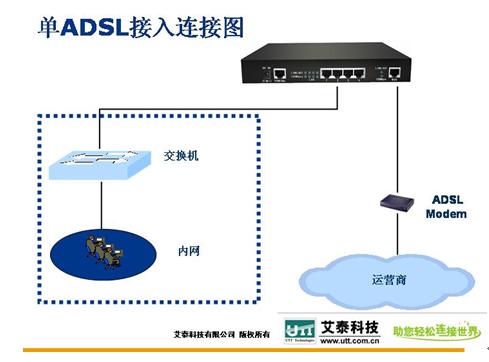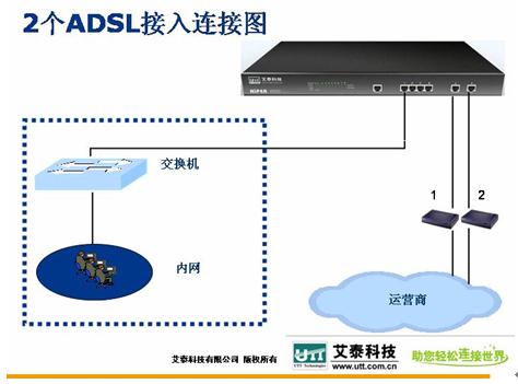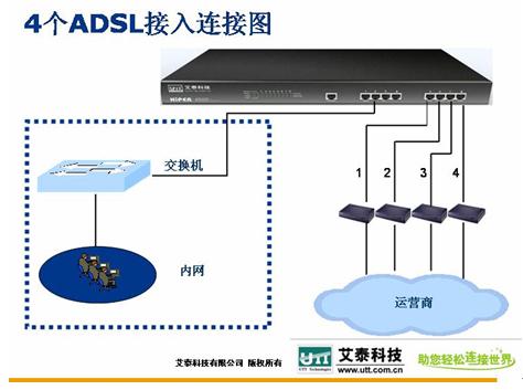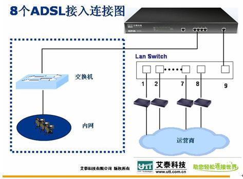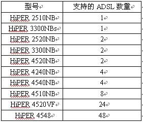 第四,实现8个ADSL 拨号连接,可以使用 HiPER 4510NB。 HiPER 4510NB支持802.1Q tag VLAN,在WAN口上可以生成8个VLAN的子接口,向外连接一个带802.1Q tag VLAN的交换机,每个子接口使用不同的MAC地址,彻底地解决了由于运营商宽带接入服务器上限制多条ADSL使用一个MAC地址的问题。同样地,HiPER 4510NB也支持光纤和ADSL的混合接入。