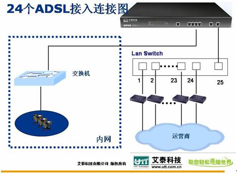 第五,实现24个ADSL拨号连接,可以使用HiPER 4520VF。 HiPER 4520VF支持802.1Q tag VLAN,在WAN口上可以配置24个VLAN的子接口,向外连接一个带802.1Q tag VLAN的交换机,每个子接口使用不同的MAC地址,和4510NB一样,支持光纤和ADSL混合接入,也解决运营商的MAC地址限制。
