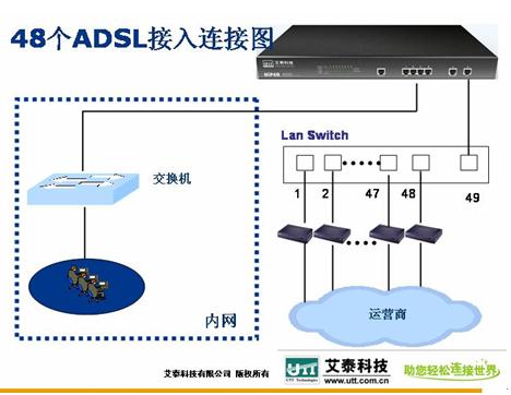 第六,实现48个ADSL拨号连接,可以使用HiPER 4548。4548支持802.1Q tag VLAN,在WAN口上可以配置48个VLAN的子接口,向外连接一个带802.1Q tag VLAN的交换机,每个子接口使用不同的MAC地址。