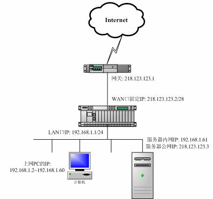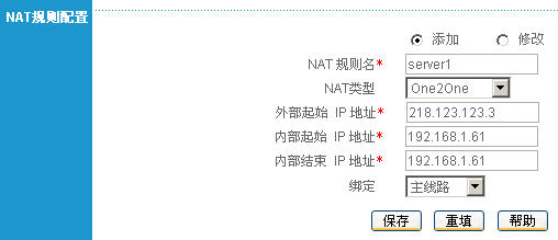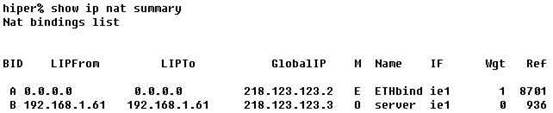 通过以上配置,内部服务器192.168.1.61和外部IP地址218.123.123.2就建立了一对一NAT映射关系,192.168.1.61上网使用218.123.123.2做NAT上网,互联网上的用户访问218.123.123.2同时也被转发到192.168.1.61相应的应用上。在路由器命令行操作界面下执行“show ip nat summary”可以看到各条NAT的配置情况: