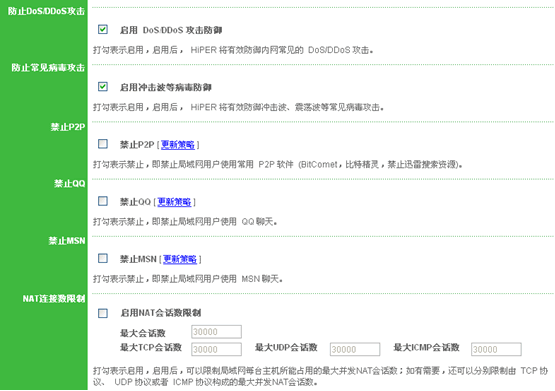 1、 轻轻一个勾,屏蔽常见蠕虫病毒、P2P软件、DoS/DDoS、QQ、MSN等,井然有序,从“勾”开始。