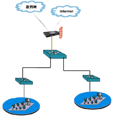 艾泰科技的多WAN口设备可以提供2-4个出口的接入,在极端情况下,可以提供8根或24根ADSL捆绑接入外网。在中小学网络,如下图,可以使用艾泰科技的双WAN口设备同时接入教育科研网和Internet,通过策略路由实现访问教育科研网流量走科研网线路;访问Internet流量走相应的运营商线路。同时当其中某条线路发生中断后,艾泰的设备能自动发现并切换,以保证网络正常运行!时时刻刻,稳定保障!