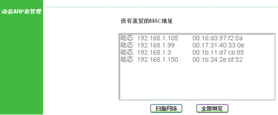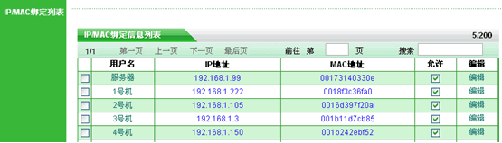 (2)、对局域网中固定IP地址的电脑,一键绑定所有电脑的IP+MAC地址