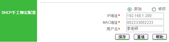 (1)、对DHCP自动分配IP地址的部分电脑,预先在DHCP静态绑定中设定,这样当此电脑自动获取IP地址的时候,设备会自动将预定义的IP地址分配给它,并自动进行绑定。