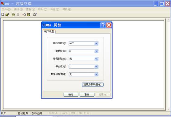 (4)选择每秒位数:9600;数据位:8;奇偶校验:无;终止位:1;数据流控制:无。