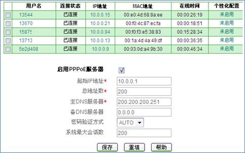 1)启用PPPoE Server功能及帐号配置: