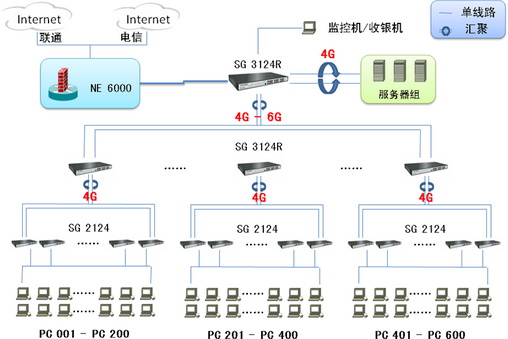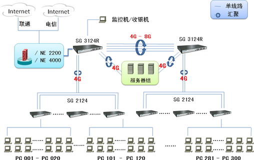 艾泰网吧汇聚解决方案提供内网4G带宽,保障内网数据高速传输,解决因内网数据量过大带来的网络慢、卡、掉,同时汇聚方案提供线路冗余,解决因为网线等物理介质故障带来的掉线甚至断网隐患,保障网吧始终不间断运营。