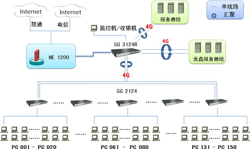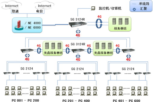 1台或多台SG 3124R,(多台核心SG 3124R之间采用4线汇聚,实现8G带宽,保障核心数据交换畅通无阻,并能实现链路冗余备份。)将网吧部分服务器(无盘服务器除外)分组汇聚接入核心的SG 3124R,均衡服务器组的负荷,实现服务器组数据分流。