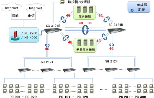 SG 3124R,分别与核心SG 3124R以及接入层交换机做2线端口汇聚,实现上下4G带宽。将网吧使用频率最高的服务器(如无盘服务器)分别汇聚接入本层SG 3124R,实现数据最小传输路径,充分分摊核心SG 3124R网络负荷。