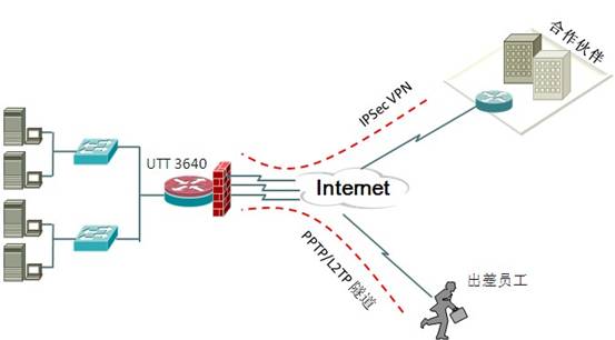 UTT 3640支持IPSec、L2TP以及PPTP三种VPN协议,它们可以单独使用,也可以结合使用;允许一方或双方动态VPN接入,可实现网关到网关、远程拨号等多种形式的VPN;可实现VPN星型连接,使得VPN流量从一个隧道经HiPER连接到另一个隧道;最多可配置50条VPN隧道,并发30条。IPSec VPN支持自动IKE和手动密钥,支持ESP/AH协议、3DES/DES/AES加密算法、SHA1/MD5认证算法,支持主模式和野蛮模式,支持抗重播、NAT穿透。