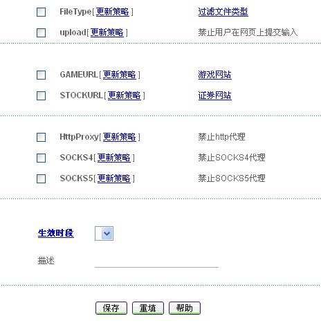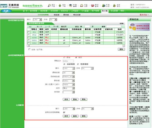 部分员工在使用公司网络的时候,在不同的时间段内喜欢看游戏网站、论坛、甚至在线看电影,使企业的网络资源白白浪费。这样的情况下我们可以使用防火墙功能通通屏蔽。如图所示: