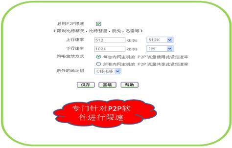 b.可以限制P2P软件(比特精灵、比特彗星、脱兔、迅雷)流量的速率,同时可以配置例外地址组不受该P2P限速的限制。