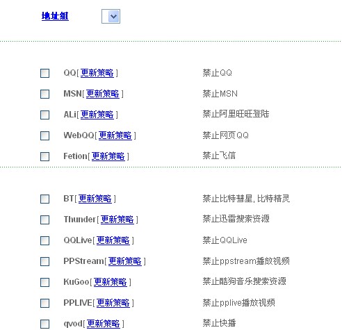 通过上网行为管理,可一键屏蔽QQ、MSN、阿里旺旺、WEBQQ、飞信、游戏等,让网络管理员快速掌控网络。