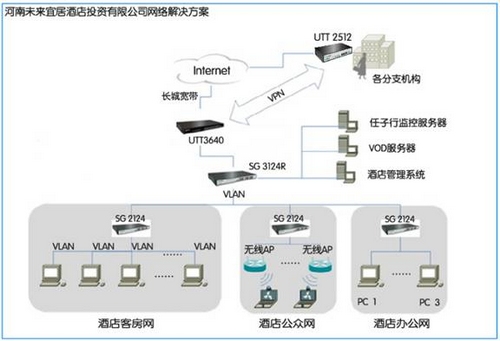 酒店总部使用艾泰科技UTT 3640安全网关,6个分支机构使用UTT 2512 安全网关,支持IPSec、L2TP以及PPTP三种VPN协议,它们可以单独使用,也可以结合使用。让分店、外地人员轻松、安全的接入酒店内部网络,实现分支机构与总部同步办公的需求。