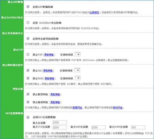 2.酒店网络安全防范:酒店网络中有大量的商务机密数据,客人在使用网络时需要保证个人信息数据的私密性,在互联网病毒、木马、黑客盛行的时代,网络的安全同时也影响到酒店网络的稳定性。酒店网络的安全性对网络管理人员来说是项极大的挑战。中进行用户上网个性化设置或用户组个性化设置,每台电脑都可以采取不同的策略(可以任意限定某台PC可使用的带宽、NAT会话数,是否禁止QQ、MSN、P2P等等),实现百分之百的按员工实际需求定制。