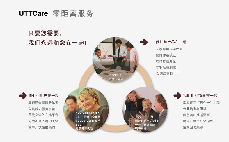 有了优秀的产品,还要有优秀的服务才能被更多的用户所认可。作为知名的网络解决方案提供商,服务也是艾泰科技的重中之重。艾泰的服务体系名字叫UTTCare,它由三大部分组成:用户、产品和经销商,针对这三种角色的特点,艾泰分别制定了不同的支持策略。在这个服务体系内,艾泰科技做了很多服务方式的创新。