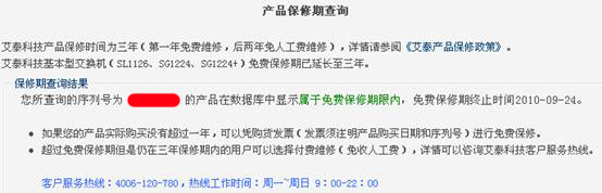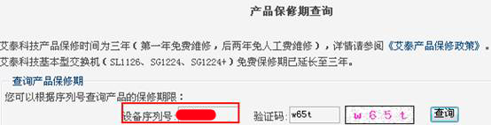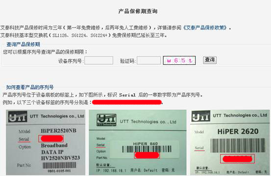 4、查看产品面板的序列号,然后通过www.utt.com.cn艾泰官网上查询是否能查询到相应的记录,不论序列号是否属于免费保修期还是超出免费保修期,都会有相应详细记录。如图所示:客户服务>产品免费保修期查询