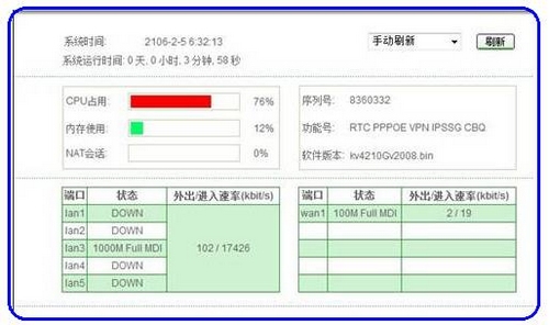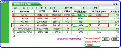 1) 进入路由器的系统状态-接口统计中,观察数据,若发现LAN/in方向数据包远大 于WAN/out数据包,则可确定存在内网攻击现象。如下图: