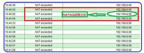 2) 进入系统状态-日志管理,查看设备系统历史记录,通过此页面的日志记录检查是否在网络异常时存在NAT会话超限的用户,通过显示出来的主机IP进行管控。如下图: