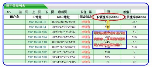 3) 可以通过用户管理-用户管理查看局域网每台主机带宽实时使用量,进而可以查看到内网当前占用带宽比较大的用户,从而进行管控,如下图: