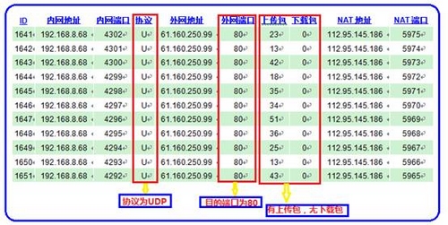 近期全国多家网吧反馈频繁掉线问题,经过分析诊断得出:因网吧用户访问了非法网站,使得PC感染病毒,病毒冲破系统防御软件后产生了协议为UDP、目标端口为80的NAT会话,相关NAT会话的上传包很多且快速增长,下载包计数一直为零,导致出口带宽被拥堵而产生掉线问题。弹指一挥间,此攻击病毒在全国网吧用户中掀起一阵流行“疯”,使网吧业主一时招架不住。为此,艾泰科技提出了自己的解决方案。