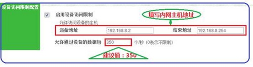 允许通过设备的数据包:设备将根据该值限制每秒通过LAN口的数据包个数,取值范围为0~20000,建议设置为300~600,这里建议设置成350。如下图:
