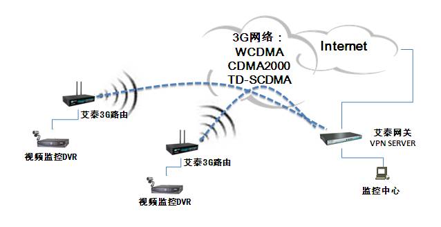 此组网方案是在艾泰 3G路由器连接到公网监控中心的基础上建立VPN隧道方式来传输视频图像 ,组网实施如下: