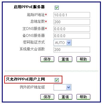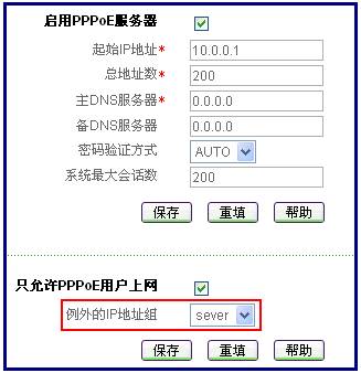 上述功能(只允许PPPoE用户上网)启用后,只允许用户电脑通过PPPoE方式拨号到路由器后访问互联网,禁止其余通过DHCP方式自动获取IP地址的用户电脑、手工配置IP地址的用户电脑上网,并且还禁止了他们访问路由器。当局域网中搭建了服务器,并且服务器使用手工配置IP地址,网关设置为路由器LAN口的IP,这样一来,通过PPPoE拨号上网的用户电脑也无法访问到服务器。那么,我们可以通过设置“例外的IP地址组”,将服务器的数据放通,让通过PPPoE方式拨号上网的用户也能访问到服务器。