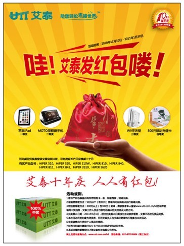2010年11月10日至2011年1月30日,艾泰在全国范围内举办“艾泰十年庆,人人有红包”的大型促销活动,凡购买艾泰基本型号产品(艾泰5系、8系、26产品),即可现场刮奖拿红包,现刮现兑!并即时延保三个月,更有IPAD、MOTO手机、WII游戏机等着大家!此期间登录在线活动专区www.utt.com.cn/hd,更有更多无限惊喜相侯。同时,针对此活动艾泰也将在全国范围内开展城市巡游推广,让更多的用户感受到艾泰热情的回馈。