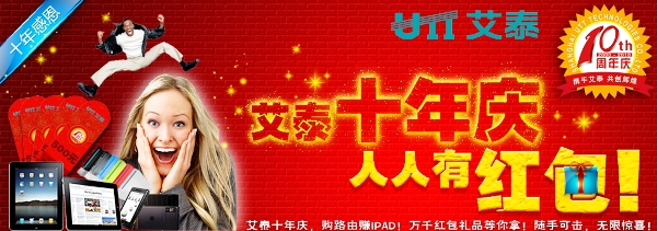 李:我公司也是刚好成立十周年,同庆!作为艾泰在广州区域的核心经销商,我司有幸参与了这次活动,是以现场刮奖的方式来参与的。凡到我公司购买艾泰基本型号产品,即可现场刮奖拿红包,现刮现兑。奖品包含现金(面值2元至50元不等)、充值卡(面值300元与500元不等)、Wii游戏机,并有机会赢取IPAD、MOTO手机等大奖,产品可即时延保三个月。
