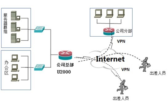 在U2000上面设置和分店的VPN配置,一端做为服务端,另外一端做为客户端,配置连接后即可实现总部和分店的相互访问操作,实现数据共享和访问更流畅,沟通更简单!