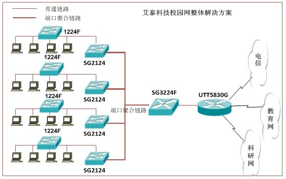 艾泰科技是中国领先的中小型网络解决方案提供商和服务商,艾泰科技为校园网提供的解决方案是采用艾泰最新推出的Further技术平台(全千兆+防火墙架构)之UTT 5830G全千兆防火墙安全网关/VPN路由器,内网架构采用SG3224F(管理型交换机)为核心交换机+SG2124F(安全型交换机)做为楼层汇聚交换机+SG1224F(基本型交换机),营造井然有序的网络!