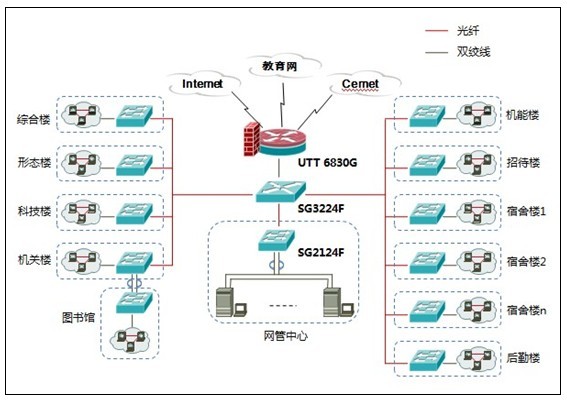 网络出口采用艾泰最新推出的Further技术平台(全千兆+防火墙架构)之UTT 6830G全千兆防火墙安全网关/VPN路由器,内网核心交换架构采用SG 3224F(管理型光纤交换机)为核心交换机+SG 2124F(安全型光纤交换机)做为楼层交换机+SG 1224F(基本型光纤交换机),打造内网高速稳定的数据传输环境。