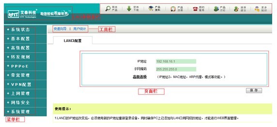 页面布局整体采用竖向菜单风格,左上角为LOGO的标签,左下栏为菜单栏,可以点击菜单栏查看设备的配置选项,正中间为页面栏,可以查看及配置各项功能,正上方当然少不了艾泰科技的个性化的快捷图标。通过页面的改进,最大限度地简化了配置操作的步骤,页面更加清析简单,一目了然。