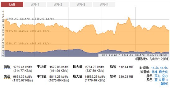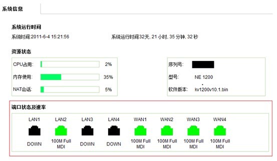 系统信息页面可以查看到系统运行时间,资源状态之外,新增加了端口的状态图标显示及速率(由之前的端口统计页面而来)和流量动态显示图。动态流量显示图,能够实时反映当前线路总带宽占用情况及各端口(LAN口、WAN口)带宽使用情况,非常清楚和方便。