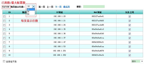 可以选择列表每页显示的行数,配置列表(如PPPoE账号配置)可选择为10、30和50,系统列表(如NAT统计)可选为20、50和100条 。这样用户就可以根据自己的习惯来选择查看显示的条目多少,不仅个性、易用,而且非常方便。