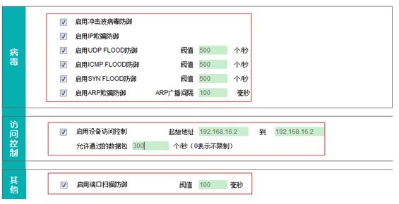 在原有的ARP欺骗,IP欺骗防御、冲击波等攻击防御功能外,新增UDP 洪水攻击防御、ICMP洪水攻击防御、SYN洪水攻击防御,以及端口扫描攻击防御,大大提升了设备应对内外网攻击防御的能力,使得系统运行更稳定,用户使用更安心!